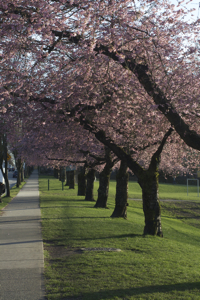 After enjoying further community shenanigans of Victoria Park carry on south along Semlin Dr one block then turn right. Time for another big hit of the drive. Walk four blocks south. If its Springtime (March/April) enjoy the view up 2nd and 3rd Ave, they will be awash with the pink blossom of Kazan Cherry trees. At this point on the walk, it’s probably time to stop for lunch, take in a street performer, or have a drink at an Italian cafe bar, before eventually turning left up 5th Ave. One block east on this road and we come to yet another green space just off of the Drive. This one is called McSpadden park and in it you’ll find community gardens and trees bordering all sides. Walk along the footpath on the right which meanders up through the park. Notice the row of unpointed hornbeams on your right before reaching, running north to south, a row of our next featured tree: The Flowering Cherry.